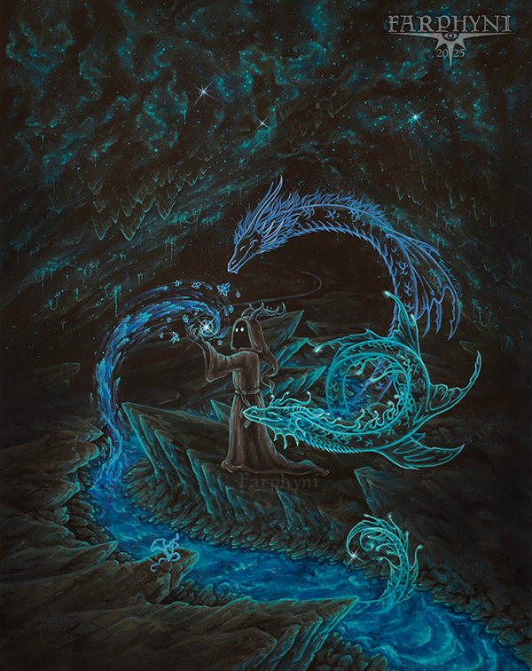 I’ve heard of an Eerie, a weird sort of Sidhe, maybe an Ellyllon, who left the Síd to wander through the known and unknown lands. She found her peace, her place to be, within an enormous cave, filled with glowing waters and curious spirits. The spirits followed her, first at distant, then up close, for she created stars to paint the cave ceiling in colors of vision and wonder. Her reason was unclear, but there were those who said that she is a keeper of forgotten dreams – that she found and kept alive what others lost. That is why she is called the Sanctum Shepherd and that once dark, now glowy cave became the safest space under the sun and moon, for nobody would dare to disturb the peace of one of the three eerie sisters.