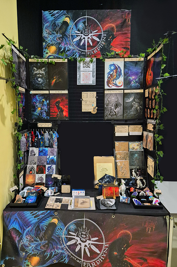 Farphyni occasionally exhibits and sells her work at conventions. You can buy original sketches & paintings, prints in different sizes (A4, A5, postcards, and Poster-size), printed bags, coasters, stickers, bookmarks, sketchbook with hand-drawn covers, sketchbook with printed covers, and her Ra’khandra figures.